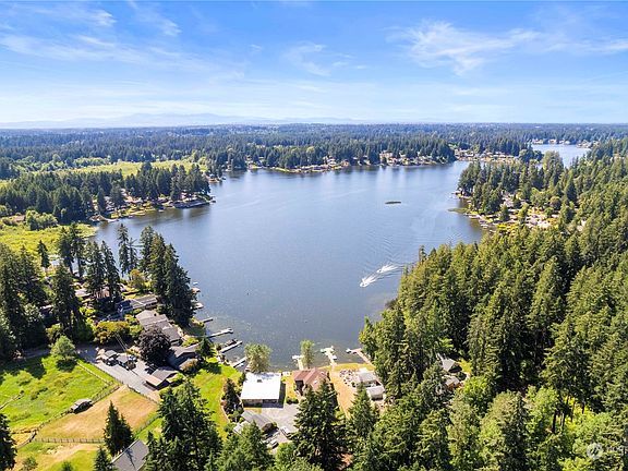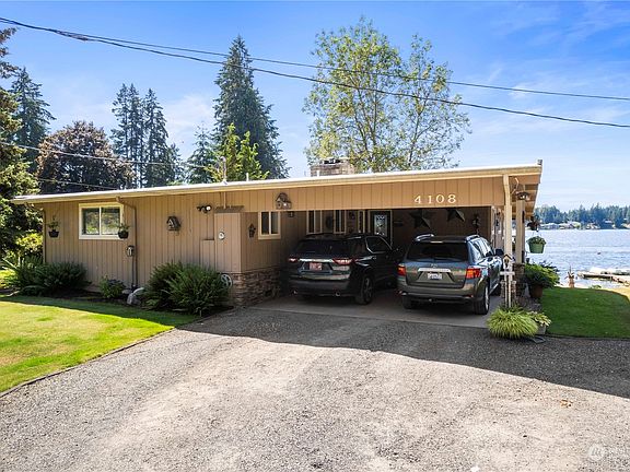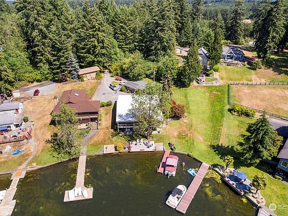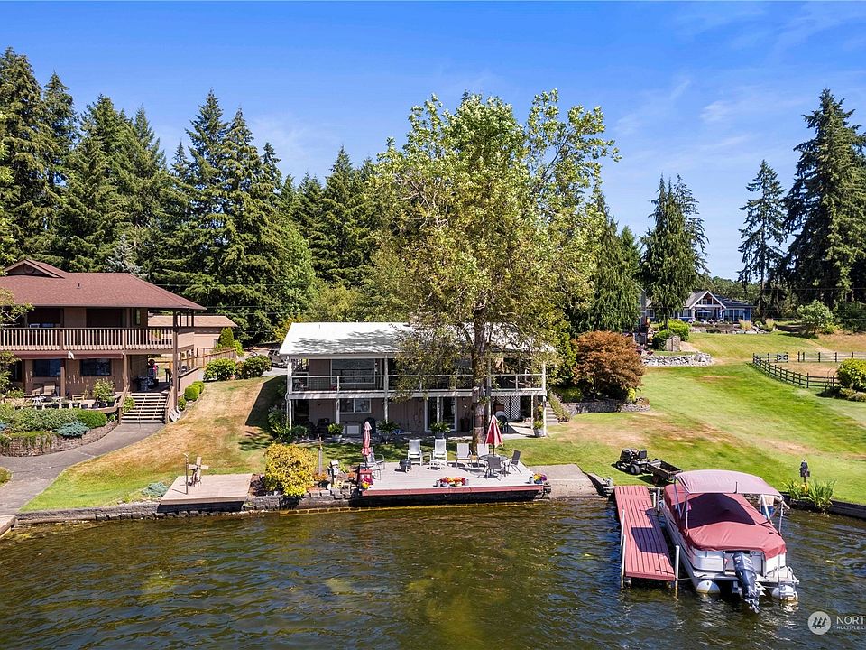Incredible, updated 3 bed+ flex rooms, 3 bath, lakefront home on large lot w/70 ft frontage on Long Lake. Daylight basement layout with Chef's kitchen, stainless apps, hardwood floors, tons of storage, large great room, and Central Vac. 2 lrge bedrooms upstairs with master suite & 3/4 bath attached, 2 extra rooms down that can be used as bedrooms and large family room. Lot boasts .88 acres, incredible views and no bank, great space for swimming, boating, and all toys, with dock, small boat ramp, multiple decks for entertaining, mature plants, new 4 bed septic and full sprinkler system with drip. Large outbuilding with shop, covered areas for storage, a guest bunk house sleeps 4, plenty of storage&parking. Great lake opportunity.