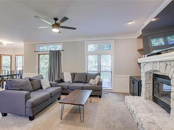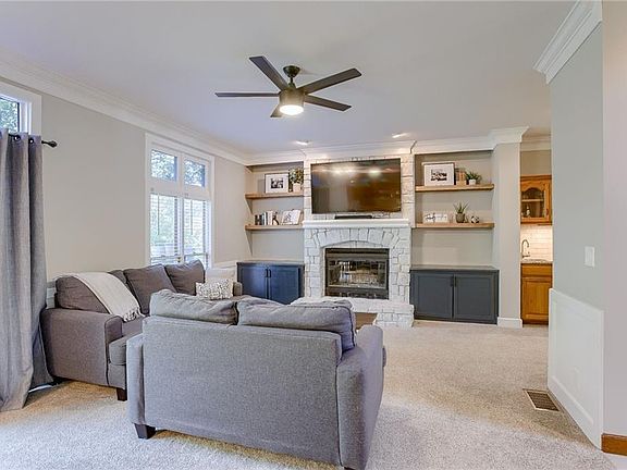 The main floor offers a gourmet kitchen with sleek granite countertops, perfect for culinary adventures. The cozy living room, adorned with a stone fireplace and built-in wet bar, is ideal for hosting gatherings.