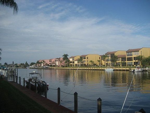 over 55 community, turnkey condo w/breathtaking view of 200' wide canal/basin. Everything you need except your suitcase & toothbrush. Includes dishes, pots, pans & linens. Very nice furnishings. Move right in. One street to Jaycee Park which sits right on the Caloosahatchee right off of lovely Beach Parkway. Bike/walk/jog paths around entire neighborhood. Fitness trail in park. 5 minutes and one turn in your boat and you are on the River heading towards, Sanibel, Fort Myers Beach or an afternoon of island hopping in search of your own private beach for the day. 30' limit on boat. In-between Cape and Midpoint Bridges for quick access to Fort Myers and the airport. Strong condo association and very well maintained. No foreclosures or short sales. All condo fees current. Large reserve. Would be a good candidate for financing. Large individual, additional storage space included. Condo building, very well maintained with covered parking.