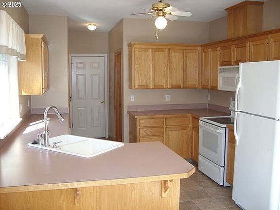 Large great room with vaulted ceilings and skylights. Large kitchen with lots of cabinet space and all appliances included. Dining area off kitchen leads to partially covered patio area overlooking nice backyard. Master bedroom has a walk-in closet and large private bathroom. Inside laundry room and two car garage with openers. Gas hot water heater and furnace/heat pump for heat and air conditioning. New furnace and heat pump in 2015. Most photos are prior to tenant occupancy but home has been well taken care of.