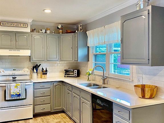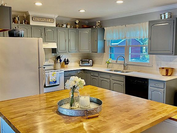 This 2 bedroom ranch with 1.5 baths is located in the quaint Port Schuyler neighborhood of Watervliet. Open floor plan on main floor. Many updates make this home a must see: kitchen renovation in 2019 includes quartz countertop, tile backsplash, recessed lighting, and large butcher block - the absolute perfect spot to entertain in! The partially finished basement with bar and half bathroom is a bonus. Breezeway connects home and garage. Both full and half bath upgrades in 2020. New electrical service and panel box in 2018. Aluminum siding painted in 2020. The large fenced in backyard is perfect for relaxing, a party or the family pet. Move right in and enjoy your walkable neighborhood to local favorites! Ring doorbell(s) and camera(s) system excluded in the sale (4 pieces in total).