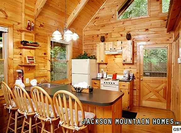 This spacious studio log cabin is located just minutes from downtown Gatlinburg and steps away from the Great Smoky Mountains Park boundary, offering privacy in a prime location. Enjoy the fully equipped kitchen, cathedral ceilings, wood floors, stone gas log fireplace, king size bed and romantic jetted whirlpool tub as well as a relaxing hot tub on the deck. Level, surfaced parking.