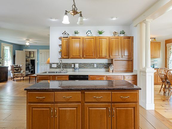 This historic farmhouse is ready for its new owner to come and make it their own. Set on 5 idyllic, quiet acres with big sky and pastural views you will love watching the world go by from your front farmer's porch, or feeling the breeze while sitting under the shade of one of your back yard maple trees! The first floor of this home has been beautifully renovated and boasts a LARGE kitchen with an island and abundant cabinets. The kitchen opens to the dining room and from there you can walk right out onto a private back porch, the perfect spot to BBQ and unwind! There is a handy 1/2 bathroom tucked in the corner of the dining room. On the other side of the kitchen you will find a large living room with beautiful maple floor and an office that could also serve as a bedroom. Adjacent to the kitchen is a large bonus room that the current owner uses to prep all the goodies for the farm stand on the property next door, but it could be used as a home office, work out room or even another bedroom! The first floor also has a primary suite with tile shower and washer and dryer hookups in the walk in closet. 80% of the first floor has radiant heat and the rest is baseboard heat. The 2nd floor is a blank slate ready to be finished with 3 bedrooms and 1 3/4 bathroom roughed in. Bathroom sink, shower and toilet are ready to be installed. You will have all the space you need for a work shop, equipment and toy storage and MORE in the expansive barn attached to the home!