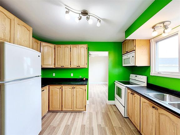 Oak cabinetsMajor appliancesWindow above the sinkLots of natural lightingNew flooringSpacious bedroomsDark vanity