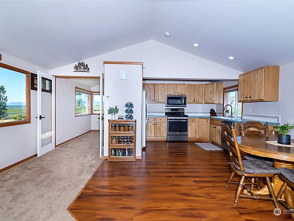 Views over the valley! A long fruit-tree lined drive leads you to the top of the knoll where you'll find this spacious 1751sqft barn-dominium w/ 2 beds/2baths, & attached 2500sqft garage/shop space. Newer mini-split heat pumps heat/cool the living space upstairs. while guests can stay in the main floor bedroom for their own space. The heated attached garage/shop area has your own entertainment bar set up for the big game & ample storage/work space. The scenic 7.28 acre property is set up to meet many needs w/ 3 horse paddocks & shelters w/ water, approx 20x40 detached shop for equip, & land for more animals or hay. Sit out on the patio & look out to the top of Mt Rainier, or enjoy the irrigated surrounding yard areas in the eastern WA sun!