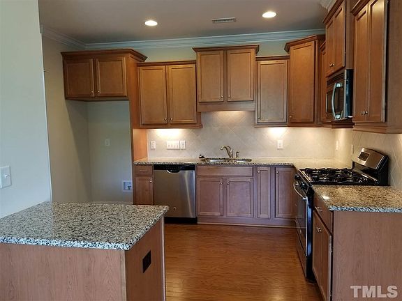 Reduced Price ! Convenient location to top schools, shopping, 540, RDU and RTP. End unit townhouse, private back/side yard and direct access to Greenway. 30 year transferable structural warranty. Popular Fontana Floor plan. Luxurious master bath w/garden tub, double vanity & WIC. Hardwood floor in first floor and 2 bedrooms upstairs. Kitchen has granite countertops with tile backsplash, SS appliances and cascading birch cabinetry. Screened rear porch. Finished walk out basement has bedroom with full bath.