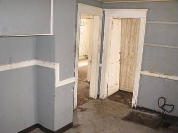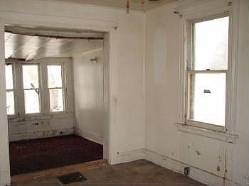 Exterior Features: Two-Story home. Siding: In fair condition, may need some repairs. Windows: In Place Soffits and Eaves: In Place. Yard: 4200 SF Patio/Porch: Covered Porch. Roof: Asphalt Shingle. Driveway: None Interior Features: Please note: Home has structural as well as foundation issues. They are noticeable inside of the home. Ceiling and roof damage is present. Living Room: Carpet in poor condition, ceiling fan, white walls and trim. Dining Room: Carpeting in poor condition, walls in poor condition. Kitchen: Cabinets and some counter-tops space, sink is missing. Bathroom: Tub, toilet and sink, intact. Bedroom: (1) Loft room, carpet, white walls in fair condition. (2) Hard wood floors, pink walls and white trim, closet space. (3) Pink walls, white trim and closet space. Basement: Unfinished Mechanics: Furnace, Hot Water Tank. Garage: None
