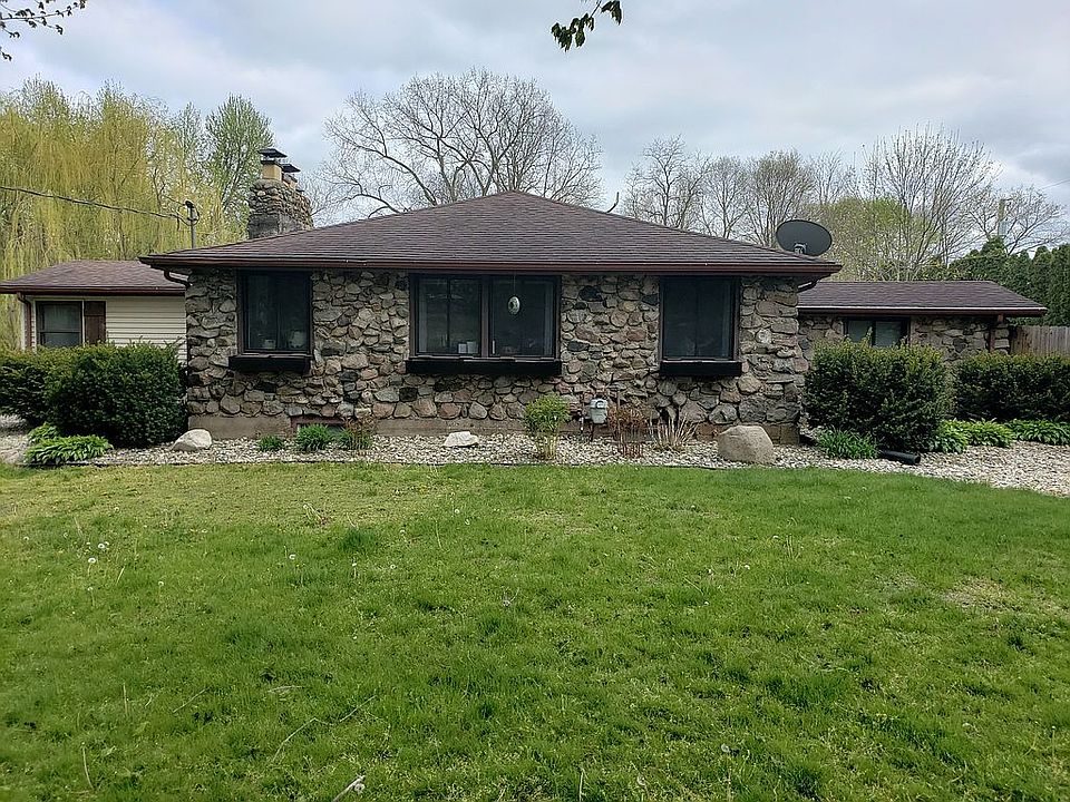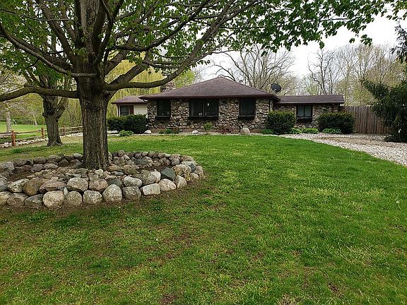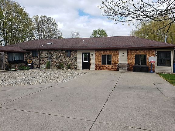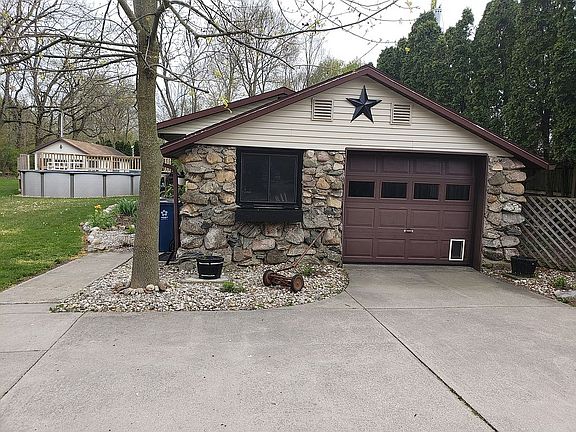 Ranch home with above ground pool with deck and pool house with bath, insulated heated/AC shop building with bath , on little Elkhart River