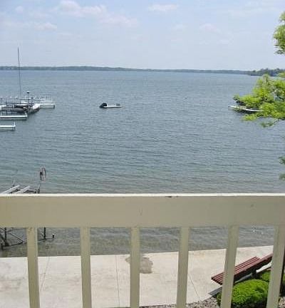 NEW PRICE!! This Harbour Condo sits on waters edge with unobstructed views! Just a few steps to waters edge. What a great place for kids to swim just off your deck. Only a few offer this AND a garage. Don't overlook the added benefit of having storage for all your lake toys and/or your car. This condo has been well cared for and is in move in condition. Nicely updated kitchen with solid surface countertops and a breakfast bar. Spacious living room/dining room combo with patio doors leading to your maintenance free deck. Two bedrooms on second floor with spacious master bedroom and balcony. Great spot for morning coffee and enjoying views of the lake. Third level is currently set up like a dorm room with half bath. Can sleep up to 12 easily or can be large rec room for the kids. Great place for that maintenance free get away!