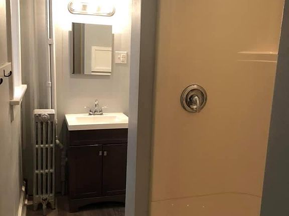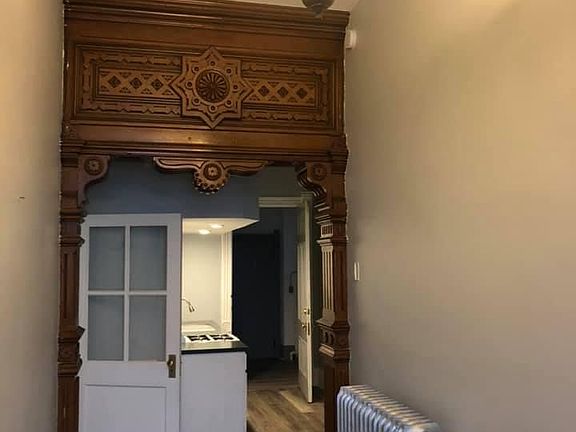 Historic renovated first floor large apartment with 1 bed and 1 bath. This apartment has an updated kitchen and bath, newer paint, refinished hardwood floors, new windows, and custom blinds. Fireplaces are decorative. Convenient laundry directly out the back door of the apartment.This apartment is available immediately and tenant is responsible for electric. Landlord pays water, sewer, trash, and heat (boiler system-radiators) One year lease, credit check and background check, application fee, no pets, no smoking. $825 a month plus deposit. Water/sewer/trash & heat included