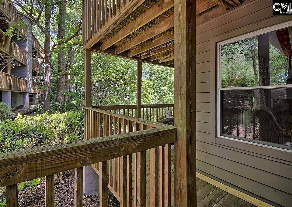 Edgewater condominium in Building 4, next to the pool. Lower level unit with three bedrooms, two baths, open floor plan, large deck, exterior storage closet. Laminate flooring throughout living areas. Updated kitchen with refrigerator, microwave over stove, dishwasher, disposal. great room has fireplace and wet bar. Master suite has walk-in closet, double sink vanity, garden tub, and door to deck. Lots of closet space. New light fixtures and fans. Shows well. Edgewater is located just minutes from downtown/USC or Lexington Medical Center/I-26. All exterior maintenance included in HOA. Walkway to Saluda River area. Move in ready!
