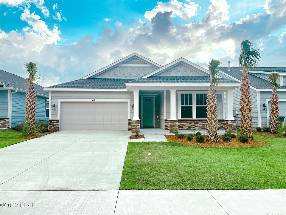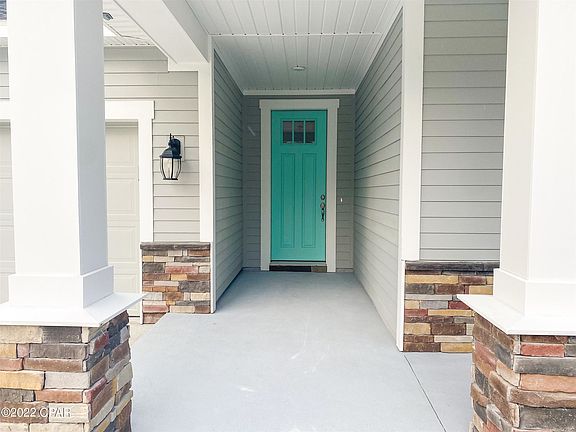 Welcome to Breakfast Point! This brand new Samuel Taylor Built Trigger floor plan is move in ready and never lived in! This home boasts gorgeous gray tone luxury vinyl plank flooring in the main living areas, white cabinets, under cabinet lighting, subway tile backsplash, quartz countertops, carrera marble looking tile in the bathrooms, subway tile surround walk in shower in the master bath, double vanity and walk in closet. Huge covered back porch and plenty of room for a pool. This home is built above current hurricane codes with 2x6 exterior wall framing, hurricane tie down rod and anchor system, architectural shingles and hurricane screens for the windows.