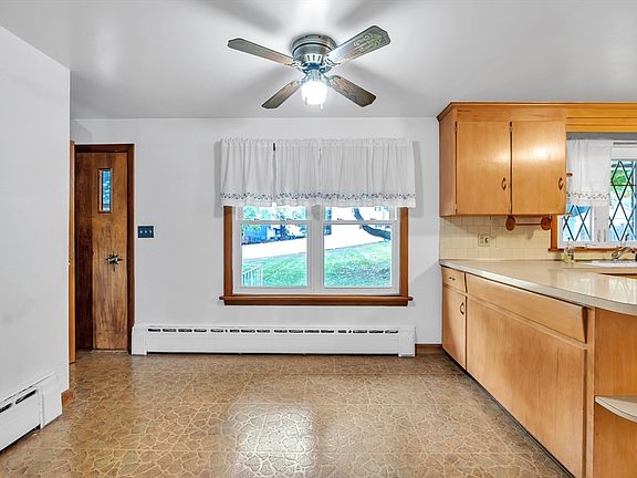 Large eat in kitchenCustom stone front fireplaceCast iron baseboardsCustom planter in foyer