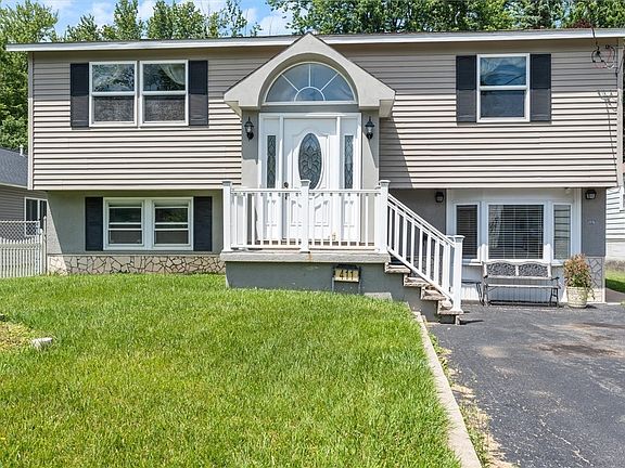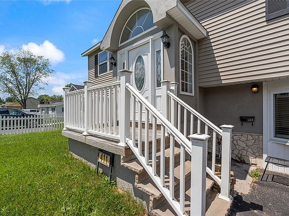 Welcome to 411 Frederick Street East, a charming raised-ranch home nestled on a quiet East Syracuse street just outside of the Village. The main level boasts an open floor plan centered around a gorgeous custom kitchen with an extra large island, granite countertops and backsplash, soft close cabinetry, and stainless steel appliances including a built-in beverage/wine cooler. The two spacious main level bedrooms abut a renovated full bath with granite countertops and tiled shower. The lower level features an extra large bedroom, living room, full kitchen, half bath with separate shower, and an additional exterior entrance - perfect for an in-law suite. The backyard is large, flat, wooded, fully-fenced and includes a large deck off of the main level kitchen. The property is located a short walk from the Village of East Syracuse and under 5 minutes drive from the shops and amenities on Bridge Street. Schedule a showing today and experience the charm of this remarkable property firsthand. ***As-is. Water line to refrigerator leaked causing some hardwoods in kitchen to buckle and damage ceiling below. New ceiling drywall below needs sanding and paint. Plumbing fixed.***