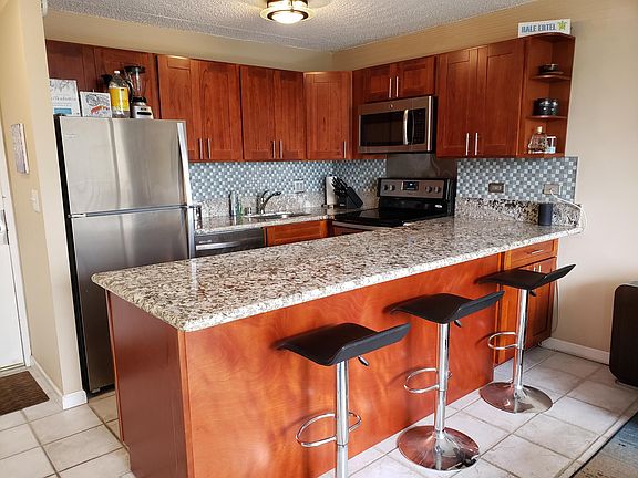 Gorgeous Condo in Prime Location- Remodeled Kitchen & Shower, plus AC! Chateau Waikiki is in the prime area of Waikiki. Tucked between Waikiki and Ala Moana and the Ala Wai canal, this area is quiet, while still being in the heart of Honolulu. You can take a walk or bike ride to Waikiki, Ala Moana mall, a few beaches and surf spots, or run along the canal. A great little grocery store is across the street, and restaurants are around the corner. There are two bike share stations within a block to make bike rides super easy. This is a spacious 1 bedroom 1 bath unit, with a spacious lanai that overlooks the canal. The Kitchen has been completely remodeled with granite counter tops, stainless steel finish appliances (fridge, oven/stove, dishwasher, microwave), gorgeous cherry wood cabinets, and tile back splash. The bathroom shower tub has been completely remodeled as well, with a brand new tub and stylish tile walls. Enjoy central AC, air conditioning, and run the in unit Washer/Dryer without the worry of the expense of the electricity electricity is INCLUDED in your rent. The building features great amenities as well; cool down in the large pool and get some sun on the pool deck, or enjoy a BBQ at the outdoor garden grilling area, or workout in one of the two fitness room (weights and cardio rooms), relax in the Sauna, or enjoy the library or party rooms. No need to look for parking in the area, your rent includes 1 dedicated parking space in the covered and secure garage. There are also guest spaces available for when your friends or family want to check out your great new home! And you can feel safe and secure Chateau Waikiki features round the clock, 24 hour security guards. Details: Rent includes electricity, water, building amenities, 1 dedicated parking space. 1 year lease for this rent $ rate (prices negotiable for higher or lower lease times) 1 months security deposit Sorry, no pets except service animals (building rules) No smoking Rent includes electricity, water, building amenities, 1 dedicated parking space. 1 year lease required for this rent $ rate (prices negotiable for higher or lower lease times) Sorry, no pets except service animals (building rules) No smoking Condo is unfurnished, except barstools (3) and a large flatscreen TV mounted on the wall.