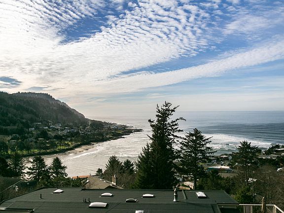 High atop the hillside with panoramic ocean and river views from almost every room. Open floor plan, plaster walls, hardwood floors, custom millwork, 3 season patio off of kitchen and meticulous landscaping make this the gem of Yachats. Master bedroom has walk in closet, radiant heated floors in bathroom, jacuzzi bath and cedar sauna.