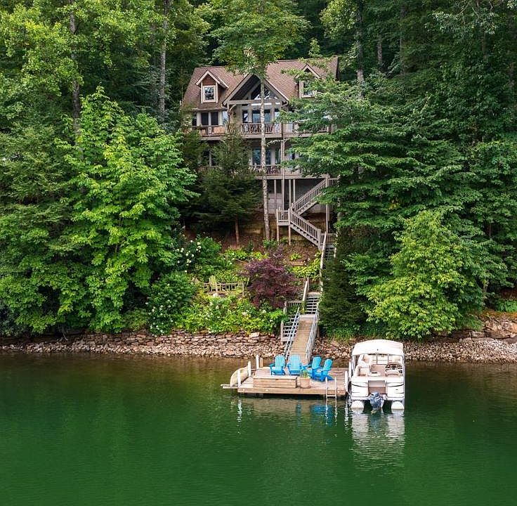 Just the right size lakefront home located on Lake Glenville, the highest lake in elevation east of the mississippi river, in a cove that has one of Lake Glenvilles unique waterfalls, know as Norton Falls. Pull right up and then just a few small steps lead you right in to this lovely custom lake front home. You will be greeted by an open main core space from the kitchen, to the dining, to the living room. Great floor to ceiling windows allows for plenty of natural light and amazing views of Lake Glenville. The Kitchen is quite spacious and offers plenty of space for everyone to gather and a gas cook top for the chef in the family. The warm and spacious master bedroom is located on the main which offers an ensuite, along with its own access to the deck. The back deck off the main offers a covered section and then two open sections. Venturing to the lower level, their is a bonus den space that is currently being used as an office. Down the hall you will come across guest bedroom two with a full bath and then guest bedroom three which also offers an ensuite. Each guest bedroom has its own access to the lower back deck. As you make your short walk down to the private dock, the property also offers a fire pit location situated close to the water..So don't miss this opportunity to purchase this lake front property that gives you flexibility for personal use, or vacation renting...