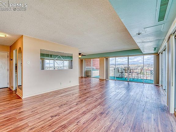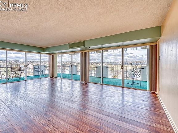 Enjoy maintenance-free living and so much more at the iconic 1960's Satellite complex! This 6th floor end unit condo has an elevator, two walls of windows facing north and east, including both bedrooms, a designated garage space, and an extensive wrap-around covered patio or lanai to enjoy amazing city views and sparkling city lights! The light, bright and open layout includes a large bedroom with a private bath and walkout to the patio, a second bedroom with patio access, full guest bath, functional galley kitchen, formal dining area, and a large living room. With sleek new wood laminate flooring and newer carpet in the bedrooms, you can move right in this home and then add your own special touches. Located in the Satellite building overlooking the Valley Hi golf course, the complex offers a mix of residential and business condos and a 76-room hotel operated by the HOA. Monthly dues cover all utilities, insurance, maintenance and management. Ten floors have community laundry and trash rooms. Amenities include an outdoor pool, gym and exercise room, men's and women's saunas, Billiards, meeting space, as well as an on-site restaurant, coffee shop, barber and spa. There is plenty of surface parking for residents and guests. Come see for yourself why the Satellite is a Colorado Springs landmark.
