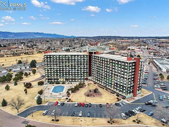 Enjoy maintenance-free living at the Satellite, a Colorado Springs landmark! The property is located on the 10th floor and provides sweeping Mountain View’s from the covered patio that extends the entire length of the unit. The living area has a spacious great room, dining area and kitchen with plenty of storage and counterspace. The large bedroom has access to the full bath and also walks out to the covered patio. Monthly dues cover all utilities, insurance, maintenance and management. Each floor has a community laundry and trash receptacles. Amenities of the Satellite include an outdoor pool, exercise room, meeting space and even a restaurant on the main level. On-site parking is plentiful and garage spaces may be rented based on availability. Note ** This Unit is fully furnished as a corporate rental and all items are included as is.