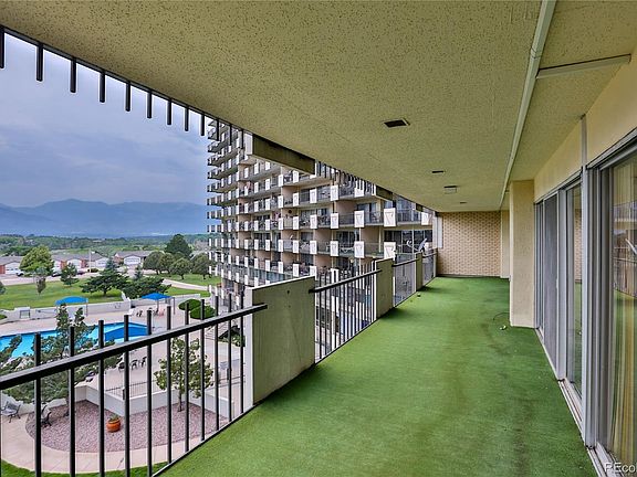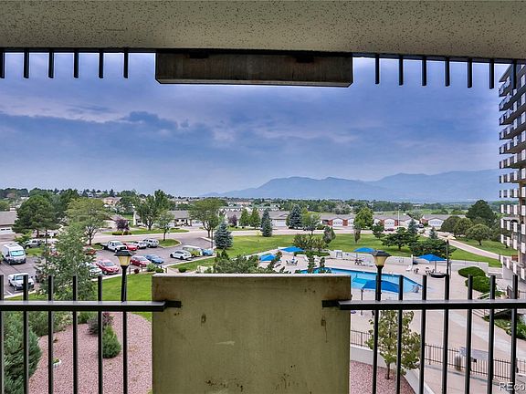 Don't miss this 2 bedroom 2 bathroom condo unit in centrally located Satellite Condos! Fourth floor location features vast views of Pikes Peak and the Front Range. Fully carpeted throughout. Enormous living room/dining room with floor-to-ceiling windows and huge balcony that extends the length of the condo! Bedrooms also have wall-to-wall windows featuring the mountains views. Complex features amenities such as, pool, fitness room, sauna, shops, on-site management office, lobby, meeting area, billiard room, library, restaurant, and more! Outdoor parking is included although a covered, deeded parking space is also available to purchase!