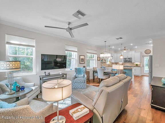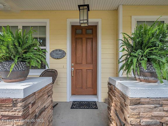 Welcome to this charming 3 bedroom 2 bath, custom-built, move-in ready bungalow situated on approximately 1/3 acre lot in one of downtown Brooksville's most desirable neighborhoods. Enter through the covered front porch to find 9-ft. ceilings and a welcoming open floor plan that flows from the light-filled living and dining areas into a functional and beautiful kitchen. The kitchen features gorgeous gray quartz countertops, upgraded lighting, custom soft-close cabinets, a coffee station, a pantry, and a counter-height bar. The spacious master bedroom has both a walk-in with shelving, and a regular closet with en-suite featuring a double vanity, and a roll-in shower with bench. Two additional bedrooms, a laundry room, and a second bathroom complete the living area. The house is 1,411 well-planned square feet. Enjoy life even more with an attached screened-in lanai and an outdoor patio with a retractable Sun Setter shade. Two-car garage. Constructed in 2017.