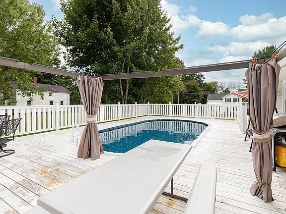 Renovated 2 bedroom, 2 full bath home with heated extra large sunroom and so much more! Open concept, with large kitchen, opening up to heated sunroom with vaulted ceiling. Walk out onto your large deck surrounding a lovely pool. Super big yard! Inside has so much to love! Previous owner did a big renovation with windows, kitchen and bathrooms redone, and much more. Current owner has done the following to continue the updates throughout...new furnace 2021, added extra heat ducts and registers, new central air 2021, refurbished hot water tank with new element 2022, all new first floor flooring, as well as new flooring in the heated 3 season room, new large front window, new plumbing in master bath, painted interior, new trim, added recessed lighting in the kitchen, microwave, 2021, stove 2021, dishwasher 2021, refrigerator 2018(as per previous owner), new garage door opener with wi-fi and camera June 2022 (open your garage door through your phone), painted pool deck and railings, and new pool pump filter May 2022. First floor laundry. 1st floor master with master bath. Heated sunroom could make a large 3rd bedroom. Taxes shown WITHOUT exemptions! Trash pick-up included in taxes