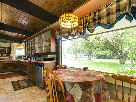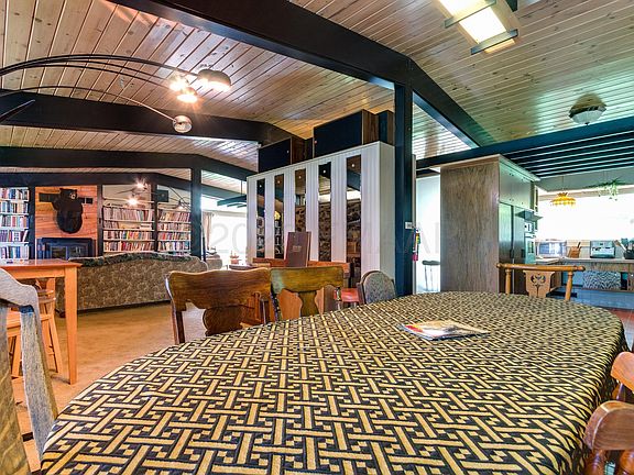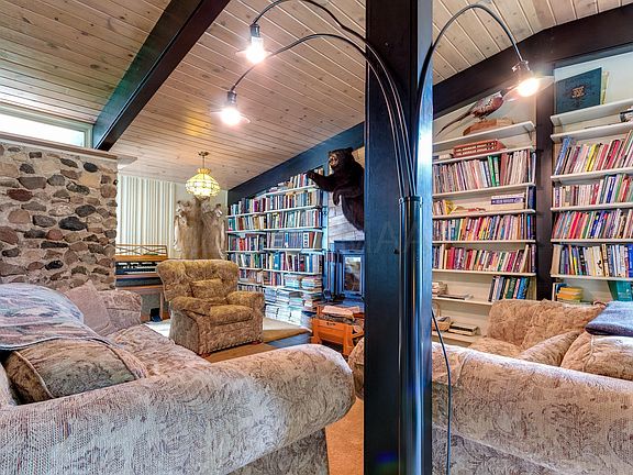 Remarkable Frank Lloyd Wright Style home, currently rented under the name Helberg Lodge. Exquisite details fill this breathtaking home, from the bookshelves to the original tile, as well as knotty pine ceilings and dark stained beams. Two living areas, each complete with wood-burning fireplaces, flank the ends of the home, with an additional converted 2 stall garage currently used for a hot tub and additional lodge space that could be restored for use as a garage. Mud room, laundry, and 4 bedrooms. Master has attached bath and tons of built-ins. Screen porch and deck for great views of Devils Lake just beyond. A stunning, unique property. Currently rented, Sale subject to tenant's rights.