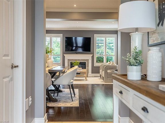 Nestled at the foot of the Niagara Escarpment, 411 McJannett Ave marries modern comfort with a cottage-like backdrop. A full-brick façade, stamped-concrete walk and covered porch hint at the meticulous care that carries through this turnkey 4-bed, 4-bath home. Step inside to 9-ft smooth ceilings, pot lights and wide-plank hardwood flowing to a sun-filled living room anchored by a gas fireplace, perfect after winter hikes on nearby trails. The quartz-clad kitchen features extended-height shaker cabinetry paired with Bosch and Samsung appliances, an expansive pantry, and a breakfast bar. Slide the garden door open and you're on a raised deck beneath a cedar-trimmed gazebo; a few steps down, a stamped-concrete patio invites al-fresco dinners. Because the fully fenced yard backs onto protected greenspace and a tranquil pond, morning coffee arrives with birdsong, not traffic, and sunsets shimmer across open water, no rear neighbours, ever. Upstairs, three generous secondary bedrooms share a refreshed four-piece bath, while the primary retreat offers soothing pond views, dual closets (one walk-in) and a spa-style ensuite with soaker tub and glass shower. Need flex space? The professionally finished basement features a 27-ft rec room, a dedicated gym zone, a two-piece bath with a shower rough-in, a full-size laundry room, and cold storage. Sherwood Community Centre, grocery, cafés and the coming Hwy 401/Tremaine interchange are minutes away, placing work, play and nature in perfect balance. Lovingly maintained and gently lived in, this home offers that rare blend of turnkey convenience and backyard serenity. Book your private tour today.