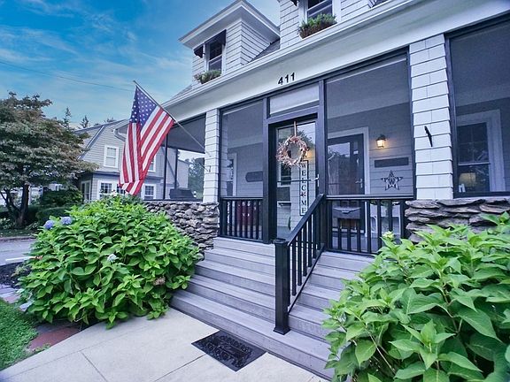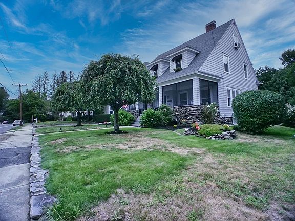Post Victorian cape w craftsman touches. Screen enclosed porch 10x38 leads to massive living room with gleaming maple floor, fieldstone fireplace with gas log and a grand staircase. Adjoining is spacious dining room with maple hardwood floors, great for entertaining and holiday get togethers. Sunken room under staircase is used as a home office, homework area, with great natural light..3/4 bath on first floor and large country kitchen with cabinets galore. Stainless appliances, dining area surrounded by windows and a handy mud room leading to the side entrance. Second floor has 3 generous bedrooms, all with hardwood floors-one with carpet. Generous bath with granite counters and tiled surround tub and shower. Great closets in all bedrooms, one walk in. 3rd floor bedroom suite is great for Main bedroom, or guest space with a private sitting area and 3/4 bath. Exterior paint 8/2022 roof 2017, gas boiler 2014,removal of knob & tube wiring. Detached 2 car garage all on the west side.