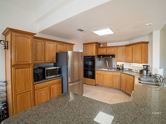 This beautiful home is located on almost five acres close to paved road with wide open views of valley and mountains! !The large kitchen has a large granite counterspace with tons of cabinets, gas stove, dishwasher and refrigerator plus a nook that looks allows for view of the mountains., Two living spaces with new engineered wood flooring, vaulted ceiling in living room and formal dining area. Fireplace is in family rooom. The masterbedroom has a large walk-in closet plus a second closet and also includes a fireplace for cosy evenings. Master bath has a large tiled shower , jetted tub plus custom counters with dual sinks. Two more large bedrooms plus another bedroom/den.and inside laundry. The home is situated to take advantage of the view and has a full lenghth patio where you can enjoy the beautiful sunset or watch the stars. Four party well.
