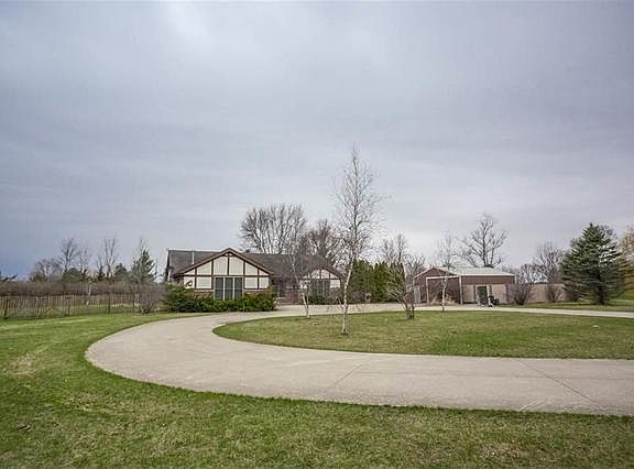 SPACIOUS TUDOR STYLE BRICK CEDAR STUCCO RANCH ON 2.5 ACRES WITH MATURE TREES WITH OVER 4000 SF OF LIVING SPACE. OPEN FLOOR PLAN WITH CATHEDRAL CEILING, WOOD FLOORS, WOODSTOVE, DOORS LEAD TO COVERED PATIO IN FENCED YARD. FORMAL LIVING ROOM AND HUGE EAT-IN KITCHEN WITH ISLAND. MASTER BEDROOM HAS LARGE ENSUITE BATH WITH TUB AND SEPARATE SHOWER AND PATIO DOOR LEADING TO DECK. BASEMENT WITH LARGE FAMILY ROOM, 2 ADDITIONAL BEDROOMS, OFFICE & FULL BATH. MUDROOM/LAUNDRY ON MAIN LEVEL AND ALSO IN LOWER LEVEL. 32X24 POLE BARN WITH CONCRETE AND FENCED STORAGE AREA. ATTACHED 2.5 CAR GARAGE WITH LARGE CIRCULAR DRIVE. MANY MATURE TREES MAKE THIS A PRIVATE COUNTRY RANCH HOME. COME & ENJOY.