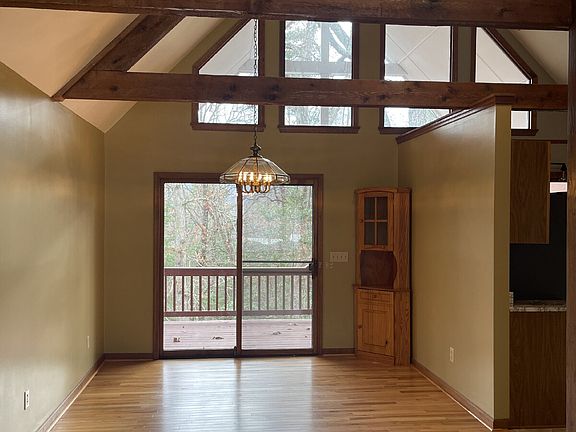 Large home, 3 bedroom, 3 full bathrooms with large bonus room downstairs, and beautiful sunroom with electric fireplace~an ideal place to relax. Covered back deck with wood views makes this convenient location even more ideal. Hardwood floors, level yard and quiet established neighborhood are all added features. Dining room and Livingroom with fireplace and vaulted, expose beam ceiling are steps to the eat in kitchen with stainless appliances and lots of cabinet space. Gas log fireplace and exposed beams created rustic charm. Split bedroom floor plan and updated bath in primary bedroom with soaking tub and step in shower make this rental a rare find. Attached two car garage with easy access to the mud room/laundry room provides storage space for bicycles, kayaks and so much more. Washer and Dryer are included. Located near shopping and Haywood Regional Medical Center with easy access to I40, convenient for those commuting to Asheville or Sylva. NO PETS, No Smoking/Vaping. 12 MONTH lease, with approved application. Application fee and security deposit required. $2250 per month $3375 security deposit