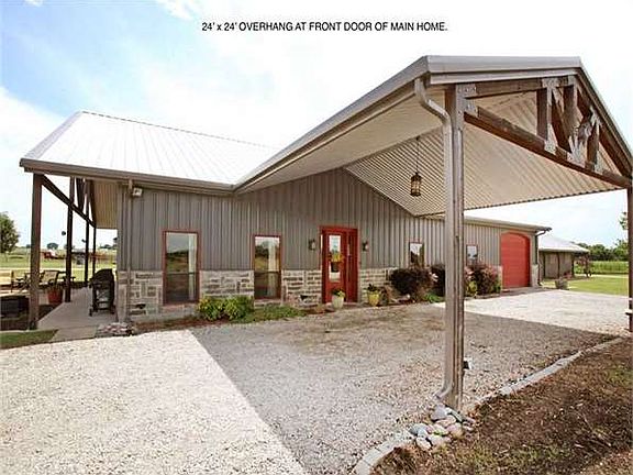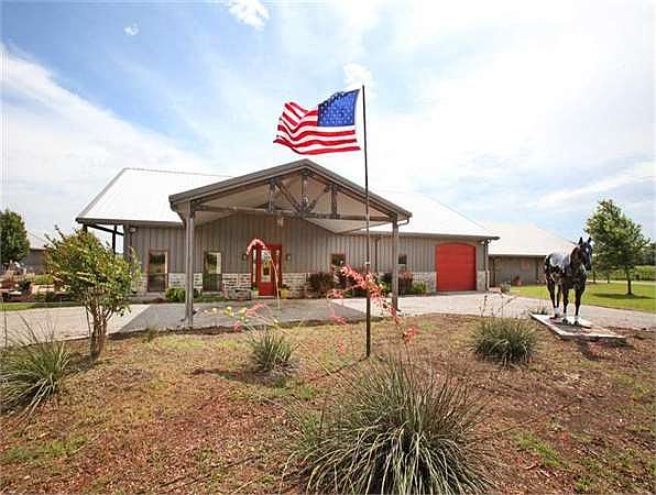 Have you ever wanted a home that was so unique and so spectacular that it was featured on ads, commercials, and TV shows- Here is your chance! This metal home with attached barn, work shop and garage is so low maintenance, and so well insulated, that you will be able to spend your time enjoying your property instead of maintaining it. This 3 bedroom 3 bath custom metal home, sometimes referred to as a barndomenium, sits on 12 acres with a custom pool and a second home, near Tom Bean in Grayson County, TX.The home is featured by Mueller Metal on their ads and commercials, and Bob Phillips with Texas Country Reporter have filmed here. It is registered with the Texas Film Commission as a remote film location. The entire building is constructed as a freestanding red-iron welded building with blanket insulation. The exterior is wainscoted with natural stone. Inside the home portion of the building, there is a 12" airspace between the metal skin and the stud wall framing, which is also insulated. This 12" airspace acts as an additional insulation barrier for the home. The great room is large and bright with the natural light from the large windows. A wood burning fireplace with a gas starter is in one corner of the living area, with a built-in entertainment center next to it. Hand painted murals enhance the Texas flavor of the home. The kitchen features granite countertops on the large breakfast bar, and Corian counter tops around the cooking area. A commercial stainless steel sink, a commercial gas stove top with pot filler, stainless double oven and microwave, stainless dishwasher and trash compactor make this kitchen a chef's delight. A built-in bar with wine rack and a built-in china cabinet enhance the beauty and function of the kitchen and dining area. Custom light fixtures adorn the house, and the wired in surround sound system provides premium sound quality. There are custom built-in cabinets throughout the house, made from Alder wood and stained to a dark patina. One of the bedrooms is currently used as an office, and includes a custom made Murphy bed, which will convey with the sale of the property.A very large utility room provides all of the room you could ever need for laundry, plus more. Built in cabinets, another sink, and room for additional appliances are all available.The master suite is something you would expect to find in a presidential suite at a 5 star resort. The master bath has a very large shower with rain shower head and body jets. The separate whirlpool tub provides a relaxing oasis after a day in the pool. Between the bath and bedroom are two large walk-in closets with three level hanging and a 24 drawer built in chest in one of the closets.An ample mud room provides a place to take off dirty shoes when entering the home from the garage, shop, or barn areas. Upon leaving the mudroom, you enter into a 18x25 garage space. Above the garage is the media room with a 106" screen, projector, and surround sound. From the garage is the 18x25 work shop with overhead door. Ample electrical plugs for all of your tools and equipment. On the other side of the shop area is the barn.The horse barn is 40x60 with a 16' wide center aisle. 5 modular stalls line one side of the barn, and a feedroom, tackroom, and office or storage area line the opposite side of the barn. A wash bay with hot and cold water and another full bathroom with a shower are also located in the barn area. Overhead doors on the end and on the side provide for airflow and access. The stalls feature fans and a misting system, along with automatic waterers and steel feeders with mangers.The separate guest house is located across the swimming pool from the main home, and has one bedroom, one bathroom, a laundry area, and a full kitchen and living room with central HVAC and it's own 18'x25' garage. Approximately