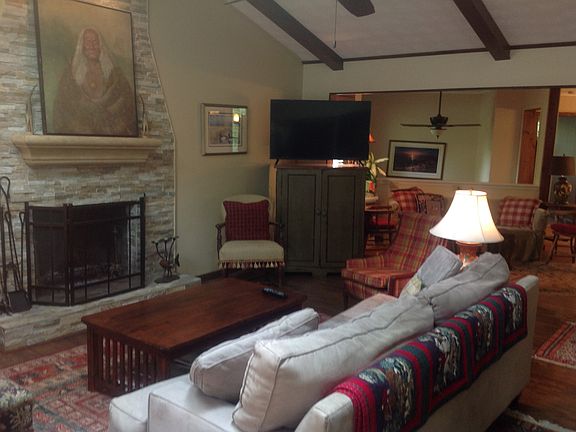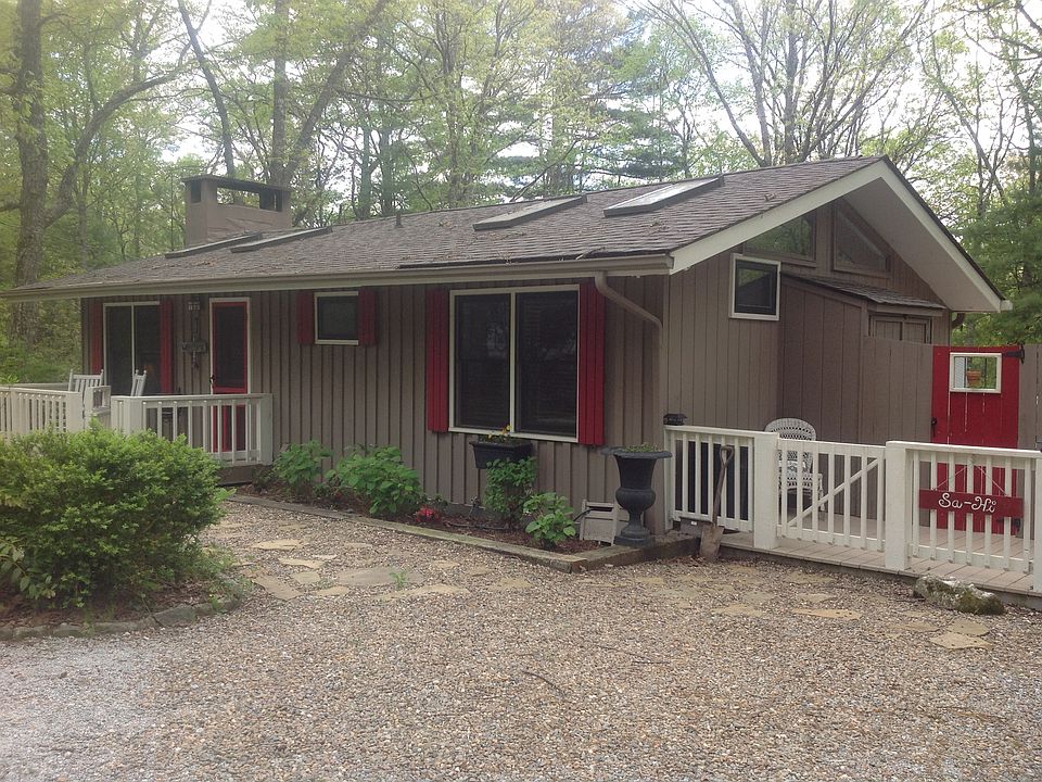 Enjoy this in-town renovated home for personal use or continue receiving rental income through VRBO rentals. Outdoors there is a rocking chair front porch, garden area, deck and screened porch. The open living area is complete with a beautiful stone fireplace, vaulted ceiling and beams in the living room; a separate dining room that opens to the screened porch; kitchen and breakfast room. The master suite is at the back of the house with french doors also opening to the screened porch. A second bedroom and hall bath complete the main level. The lower level has 2 bedrooms and a full bath plus a day kitchen There is a newly added 1 bedroom/1 bath guest house with separate entrance and parking on lower level Hardwood floors throughout the main House. The neighborhood is very quiet and less than a mile from Main Street. The house is located on a level lot on City Street so no issues during the winter. Well just insulated for year round living. Both main house have skylights and vaulted ceilings in living area for lots of natural light and a wonderful open feeling.
