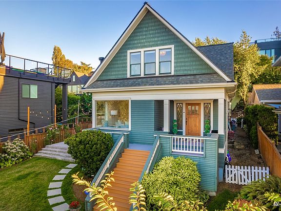 Quintessential Queen Anne Craftsman with the most mesmerizing views! Welcome to your secluded & private home perched above it all. The covered porch welcomes you into the foyer & leads to the light filled living room w/ gas fireplace, opens up to the dining room & entertainer's dream kitchen! Recently renovated w/ oversized island, SS appliances & sunny breakfast nook. Go out the French doors to new multi-level patio to take in the views & fully fence yard. Two large beds & five-piece bath upstairs, & enjoy your morning coffee off the private primary bed balcony. Fully finished basement extends living space w/ family room, 3rd bed/office/workout space & laundry room that is plumbed for a bath. Easy access to Google, FB & Amazon campuses.