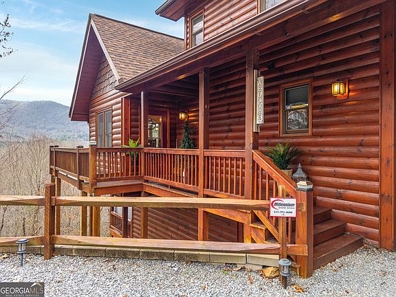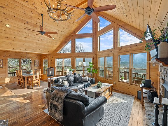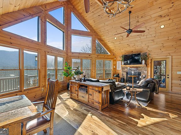 Nestled in the heart of the Aska Adventure Area and surrounded by privacy and seclusion yet just 10 minutes from the shops & restaurants of downtown Blue Ridge, this beautifully crafted log cabin is perfectly positioned to capture sweeping long-range mountain views while offering easy access to hiking and biking trails, tubing and kayaking on the Toccoa River, and exceptional fishing for rainbow, brown, and brook trout. An entertainer's dream home, you'll fall in love with the double-decker wraparound decks, with the upper, ground-level deck featuring a striking stone-clad wood-burning fireplace with a hand-hewn log beam mantel and built-in speaker system, and the lower level offering a private hot tub overlooking the natural landscape. Inside, engineered hardwood floors and tongue-and-groove walls and ceilings complement a vaulted, open-concept main living area where clerestory windows fill the space with natural light and frame the views beyond, while deck access from the dining area makes entertaining effortless. Hand-crafted twig railings and a built-in desk at the upstairs landing add warmth and character throughout. The home offers one bedroom and one full bath on each level for a total of three, with the upstairs serving as a private primary suite featuring a spa-like bath with soaking tub, walk-in shower, and dual vanity. The finished lower level enhances the experience with a cozy den complete with a stone fireplace, wet bar, air hockey table, and gaming console, creating a welcoming space for relaxing and entertaining. With log siding, a roof just two years old, and short-term rental-friendly flexibility, this mountain retreat invites you to experience the Blue Ridge lifestyle for yourself or share it with guests as a unique investment opportunity. Schedule your showing today!