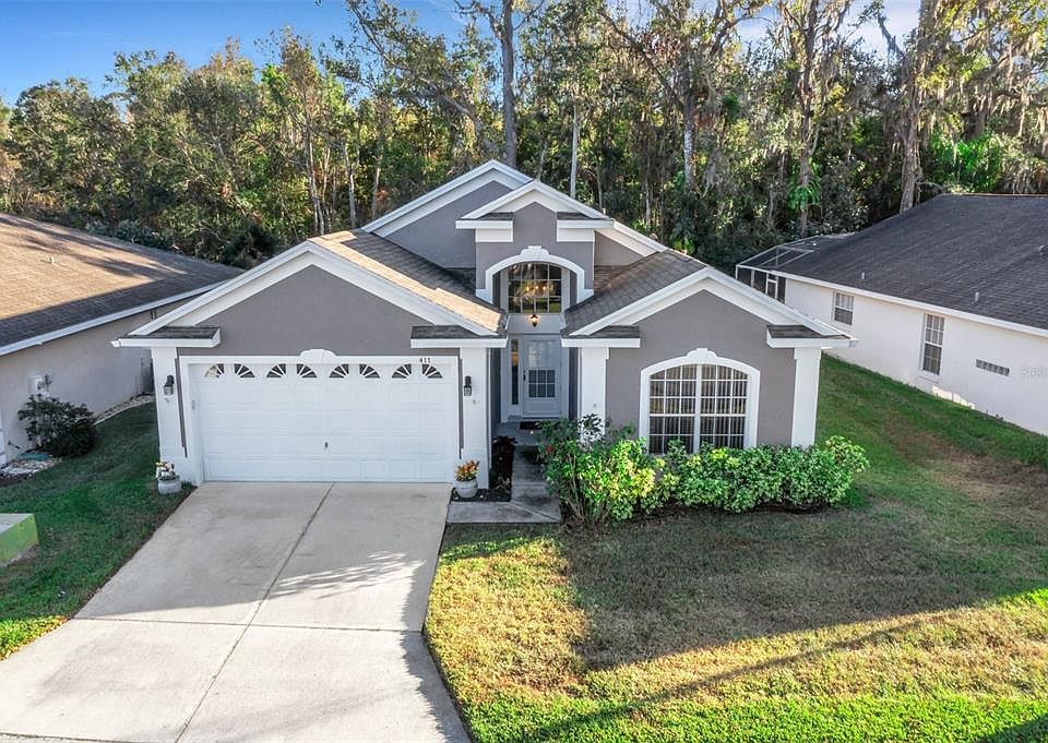 This unfurnished home is the popular RidgeDale floor plan inside High Vista, a 55+ community located in the guard gated community of Ridgewood Lakes. Situated in a desirable location with the conservation area behind it. The well maintained home has 3 bedrooms and 2 bathrooms, a great room, formal and informal dining areas. There are ceiling fans in all bedrooms and the living room. Floors are a combination of tile and a wood laminate. Systems replaced are the HVAC in 2017, the roof in 2016,and the exterior was painted in 2023. The screened in lanai out back provides comfortable viewing of the conservation area. The primary bedroom is large enough for a king. Dual sinks in the primary bathroom as well as a separate tub and shower. HOA dues paid by the owner and include lawn maintenance and basic cable. Amenities include a clubhouse with a pub, fitness center, heated pool and spa, tennis, bocce ball, shuffleboard, and pickleball. Plenty of walking and biking trails as well as lakes for catch and release fishing. Adjacent to the golf course and close by shopping, restaurants, Advent Health Hospital, and theme parks.