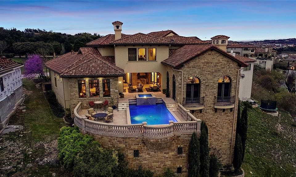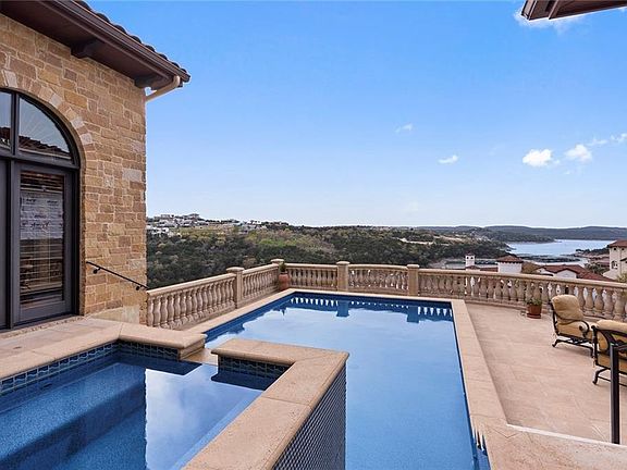 This updated custom home is a true escape in the exclusive boating community at Rough Hollow Lakeway. The private setting overlooks a pool oasis, the marina, Lake Travis and the Texas Hill Country. Santa Barbara inspired architectural details enhance the dramatic ceiling treatments throughout and are complimented by the amazing views. Grand spatial living areas with cathedral ceilings and exposed beams and a massive kitchen open to generous covered outdoor living area with fireplace, grill, pool bath