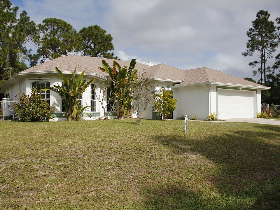 Spacious 4 bedroom concrete block home on a fenced double lot of over half an acre. New roof with architectural shingles in 2018. New air conditioner in 2017. Central bathroom redone in 2020. Brand new carpeting. New interior paint. Includes Storm Shutters. Beautiful architectural features include vaulted ceiling in living and dining rooms, as well as tray ceiling in large master bedroom. Large, tranquil screened porch with trussed roof. Fruit trees include mango, citrus and plum. Close to shopping, restaurants, golf and schools. Come see for yourself all that can be yours for the low list price.