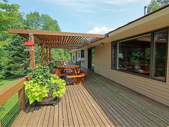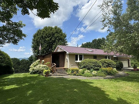 Loved and updated Ranch has an open floor plan, wrap-around deck with Pergola, and stunning peeks at the mountains! Shiny hardwood floors cover most of the main level. Spacious kitchen features a breakfast bar and granite counters. Convenient dining area with brick surround gas stove and slider doors to the deck. Living room has vaulted ceilings and access to the side covered porch. A large bedroom, ¾ bath with double sinks and a skylight, and bright office complete the main level. Heading down to the mostly finished lower level, enjoy a large bonus room, bedroom, ¾ bath, and handy laundry room. The basement offers plenty of storage in the 2 unfinished utility rooms. Hot water tank and washer/dryer are new! Other great features include a cedar closet, so many built-ins, large attached 2-car garage with a workshop area and ample storage above, amazing landscaping, standing seam roof, and even an attic fan to keep cool on hot summer days! World class skiing at nearby Stowe and Sugarbush, as well as attractions like the Waterbury Reservoir, Hunger Mountain trails, 2 golf courses, and many breweries and restaurants! Close to I-89 and only 30 miles to Burlington!