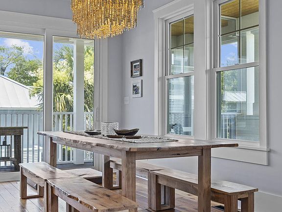 As you arrive, you'll be greeted by a striking mahogany front door and pine porch ceilings that set the tone for what awaits inside. Step onto the inviting Ipe decking and take in the serene surroundings before entering through the 8' doors into a home adorned with heart pine wood floors and extensive millwork including shiplap accents.