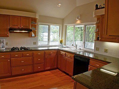 Immaculate Condition.New Roof! Main-level living, two-story has filtered, peekaboo view and boasts classic hardwood, expanse of windows,and large deck with entry from family room and master bedroom. Vaulted ceiling, skylight. Kitchen features granite,newer appliances, maple cabinets(some with glass) and counter space for bar stools. Spacious kitchen windows. Adjacent double doors to deck. Master bedroom has glass-block double shower and heated flooring.
