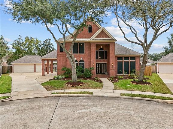 Stunning two-story home nestled on a 0.25-acre cul-de-sac lot, offering space, privacy, and elegance. Step through the double-door entry to soaring ceilings, a curved staircase, and a bright, open layout. The desirable floor plan includes two bedrooms on the first floor, including a luxurious primary suite with a fireplace, custom closet, and spa-like en-suite bath featuring double sinks, a soaking tub, and a walk-in shower. Enjoy a private study and formal dining room. The chef’s eat-in island kitchen boasts expansive countertops, a butler’s pantry, and double ovens. Morning light fills the home through abundant windows, while the living room features a double-sided fireplace and views of the sparkling pool. Upstairs offers three additional bedrooms, two full baths, a game room, and a computer nook. Vacation 365 days a year in your backyard oasis. A 3-car detached garage and porte-cochère complete this exceptional property. Zoned to CCISD.