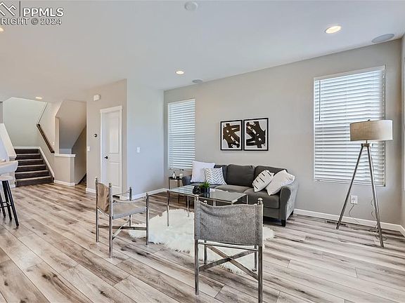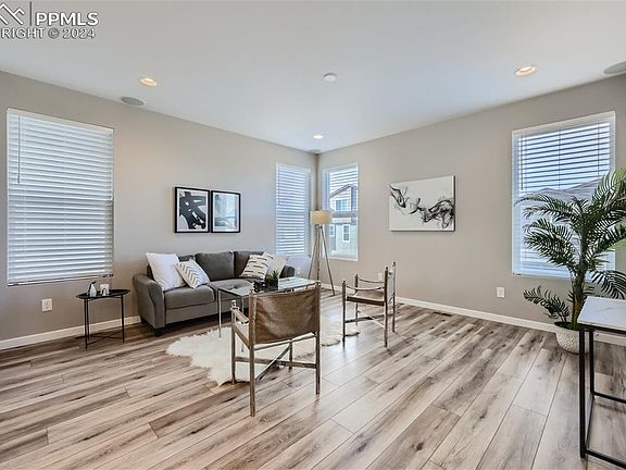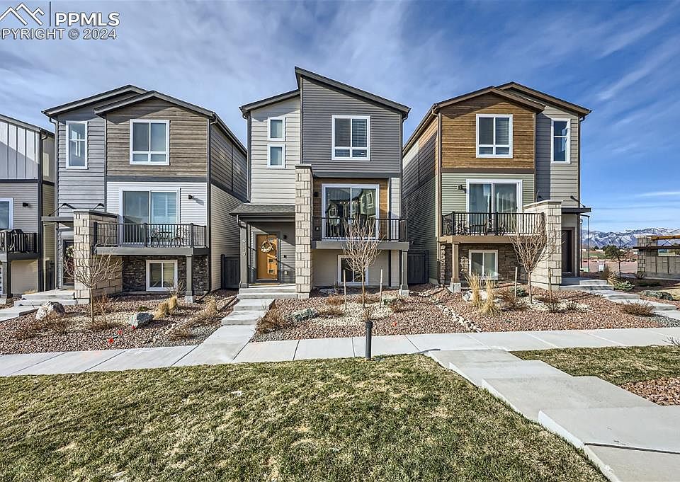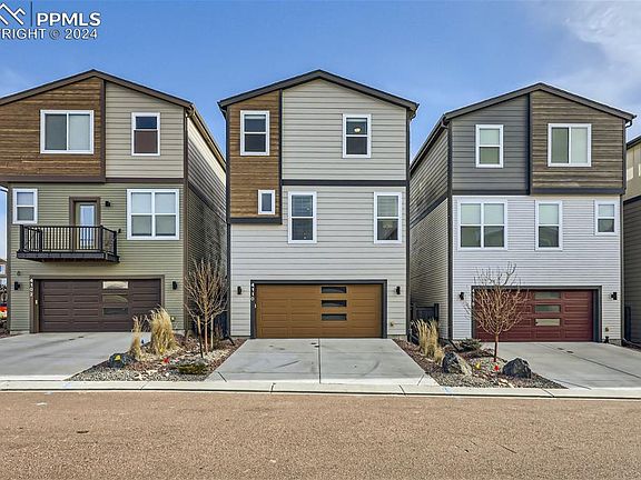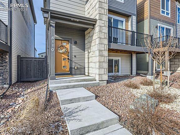 Incredible single family Mountain Modern home in Academy School District 20! Fantastic and versatile floorplan offers 3 bedrooms on the upper level and a 4th bedroom with attached bath on the lower level. Prime location with BIG Pikes Peak and mountain views, a spacious deck off of the kitchen and dining area (great for grilling out) that overlooks the adjacent green space and park! Gorgeous kitchen with large center island with bonus seating, a walk in pantry, gas range and beautiful design selections. Large Primary Suite with en suite spa-like bath with walk in shower and oversized walk in closet. Custom window coverings - including electric shades for hard to reach areas! Large 2 car attached garage with Tesla charger (professionally installed and permitted) and smart overhead door opener.