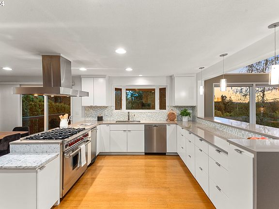Exquisite Contemporary Remodeled 6BR/3.5BA Retreat in Bridlemile-Southwest Hills! Indulge in unparalleled luxury with this stunning 6-bedroom, 3.5-bathroom impeccably remodeled home. With its soaring, elevated interiors and windows that extend from the floor to the ceiling, this home is flooded with natural light, showcasing its exquisite tiled and laminate surfaces throughout. Two fireplaces offer warmth and ambiance, creating an inviting atmosphere for gatherings. The spacious kitchen is a chef's dream, featuring a large eat-in kitchen bar, ample counter space, and sleek stainless appliances including a gas range and hood, and two ovens for the ultimate cooking experience. The oversized primary ensuite is a sanctuary of relaxation, boasting double sinks, a tiled surround around shower, a separate soaking tub, and an expansive walk-in closet complete with an abundance of built-ins. Downstairs, the daylight basement offers a family room with another fireplace, perfect for cozy evenings in. Each bedroom is generously sized, offering comfort and versatility. The large basement presents an opportunity for creative customization to suit your needs. Outside, a large deck off the dining room overlooks the beautifully landscaped backyard retreat, providing a serene setting for outdoor entertaining or relaxation. With so much to offer, this home embodies the epitome of luxury living. Don't miss out on the opportunity to make this your own private sanctuary! [Home Energy Score = 2. HES Report at https://rpt.greenbuildingregistry.com/hes/OR10226799]