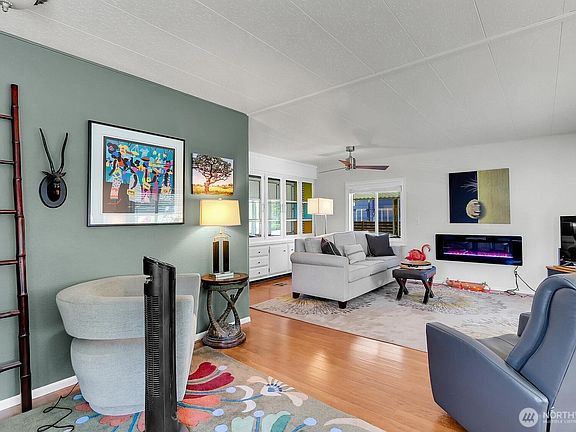 Updated double-wide with A/C in 55+ park. Updates include newer windows, new roof in 2019 (with warranty), new interior doors and trim, wood flooring, tile in Primary bath. Kitchen updates include some new cabinets with pull outs, tile backsplash, under cabinet lighting, stacked stone on back of peninsula. White 2” blinds throughout except the Primary bedroom, which has top down/bottom up Levelor blinds (with warranty). Beautiful front landscaping, covered porch, single car carport and guest parking spaces directly adjacent to the home! Much of the furniture can stay.