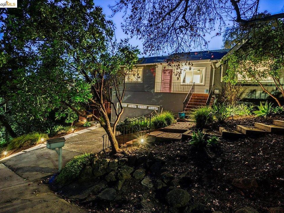 Bay Views!! Gorgeous mid century 3 bedroom + downstairs Office Nook, 2 bathroom home with light filled, open floor plan in gorgeous beamed ceiling living and dining rooms. Dining room has built in side board between kitchen, dining and outdoor patio for indoor and outdoor flow/entertaining. Impressive and fully remodeled kitchen with white marble counter and s/s appliances has sliding glass door which leads to the beautiful outdoor Oasis backyard. Tiered garden with new level lawn and multiple patio areas perfect for outdoor dining and lounging. Lighted stairs lead to upper level garden space for treetop private views of the bay. Otherwise, lower level area with raised garden beds. Home feels VERY private as it sitting on a hillside with only one immediate neighbor. Easy-Strolling neighborhood, urban paths: McCrea Mem, Oakland Casting Club, Leona Heights hiking, miles of trails in Redwood National Forest -Oakland Hills, Redwood Heights Recreation and Shopping Center; Laurel, Dimond and Montclair shopping nearby. EV charger! Nearby Hwys 13, 24 and 580 provide quick access to SF. AC Transbay Bus for commuter but to SF.