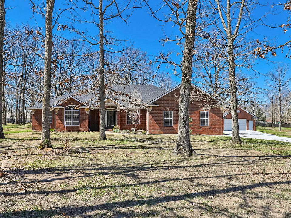Just 3 miles north of CMH Hospital in Bolivar is a home tucked away among mature trees in a park like setting on 1.5 acres delivering a great sense of privacy in the Cherry Blossom Hills subdivision. The ranch style home offers 3 bedrooms with the main bedroom being on the opposite end of the home from the other 2 bedrooms. The home has an additional room that could easily be used as a 4th (non-conforming) bedroom or office/study. The central part of the home is the large family room with a full wall of windows providing natural light and views of the treelined property. The room has a propane gas fireplace for an alternative heating source and high, tray ceilings. The kitchen has a bay window and large island to maximize the space. The formal dining room provides crown molding around the ceiling and is a perfect place for dinner parties. Go into the main bedroom and open the double doors to the main bathroom and you will find two walk-in closets, a frameless shower, and an oversized jetted tub. The back doors of the home open to the covered patio looking over the fenced backyard. From a function perspective, the home offers an oversized laundry/mudroom with a large walk-in closet for additional storage. Bring all your cars, motorcycles, or toys as the home has a large 2 car garage attached to the home along with a detached garage for two cars that is insulated with electrical. The home offers a new roof, new guttering with gutter guards, and a fresh gravel overlay on the driveway. The property is a wonderful balance of country quietness, but still close to the wonderful community of Bolivar!