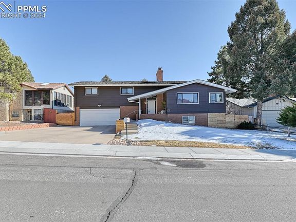 This move-in-ready 4-bed, 3-bath gem is ideally situated below the bluffs, offering stunning views of Palmer Park and Pikes Peak, with easy access to military bases, parks, trails, shopping, and schools. The main floor welcomes you with a large entryway, bathed in natural light and complemented by recessed lighting. The spacious and open kitchen is perfect for entertaining or cooking family meals. There are two bathrooms upstairs, with a shower in the master bathroom and a tub/shower combo in the main bathroom. This home also boasts two built-in desks, two fireplaces, and a charming sunroom off the main living area for relaxing and enjoy the surrounding beauty. The fully finished basement is versatile, featuring a bathroom with a shower, laundry room, family room, office, and bedroom. Accessibility and convenience are provided by the walkouts to both the backyard and the oversized 2-car garage that has two workbenches and storage shelves. The living space flows to the outside with a covered deck for intimate dinners and a covered patio for entertaining. The mature trees and lush grass create a picturesque landscape that is complemented by raised garden beds and a playset for family enjoyment. Lawn maintenance is simplified by the automatic sprinkler system plus additional drip system to the trees. The brand-new composite roof was installed in March 2024, and this is one of the rare homes in this neighborhood with central air conditioning. Don't miss the chance to make this exceptional property your new home, where every detail has been carefully considered!