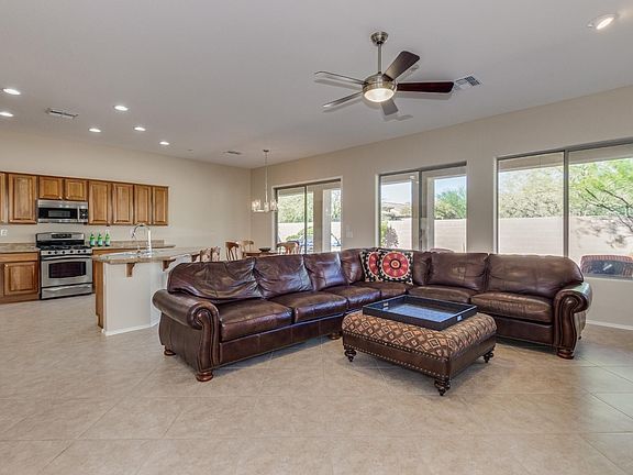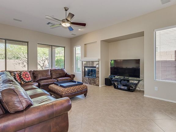 Anthem Country Club! Popular and hard to find single-level San Juan model offers all the right rooms for today's lifestyle - 3 bed, 2.5 bath, great room, and breakfast room plus formal living/dining AND a den/office. Enter through a beautiful front courtyard and enjoy views of Daisy Mountain from kitchen, great room, and extended covered patio. Large and open kitchen has granite slab counters, gas stove, new faucet, and roll out shelves. Surround sound in great room. 20'' diagonal tile in all the right places. Interior just painted throughout, new lighting/ceiling fan. Perfect time of year to relax by the backyard fire pit. Desirable north/south exposure; 3 car garage; built-in BBQ; reverse osmosis in kitchen; water softener;